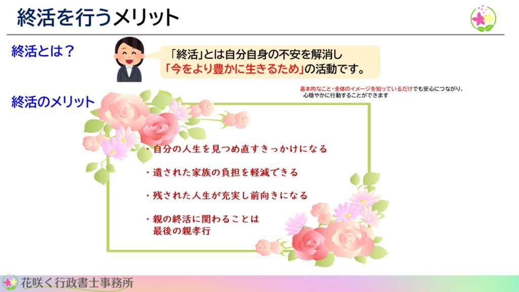 花咲く行政書士事務所では、一人ひとりの状況に合わせて、無理のない終活の進め方をご提案しています。